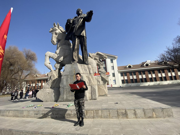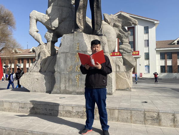 在2022级研究生邓雪薇的带领下,全体师生面对王震将军的雕像庄严宣誓:“继承革命遗志,发扬艰苦奋斗、戒骄戒躁的优良传统,感怀祖国烈土……为实现中华民族伟大复兴的中国梦奋斗不息”,许党报国的铮铮誓言在军垦博物馆门前回荡。