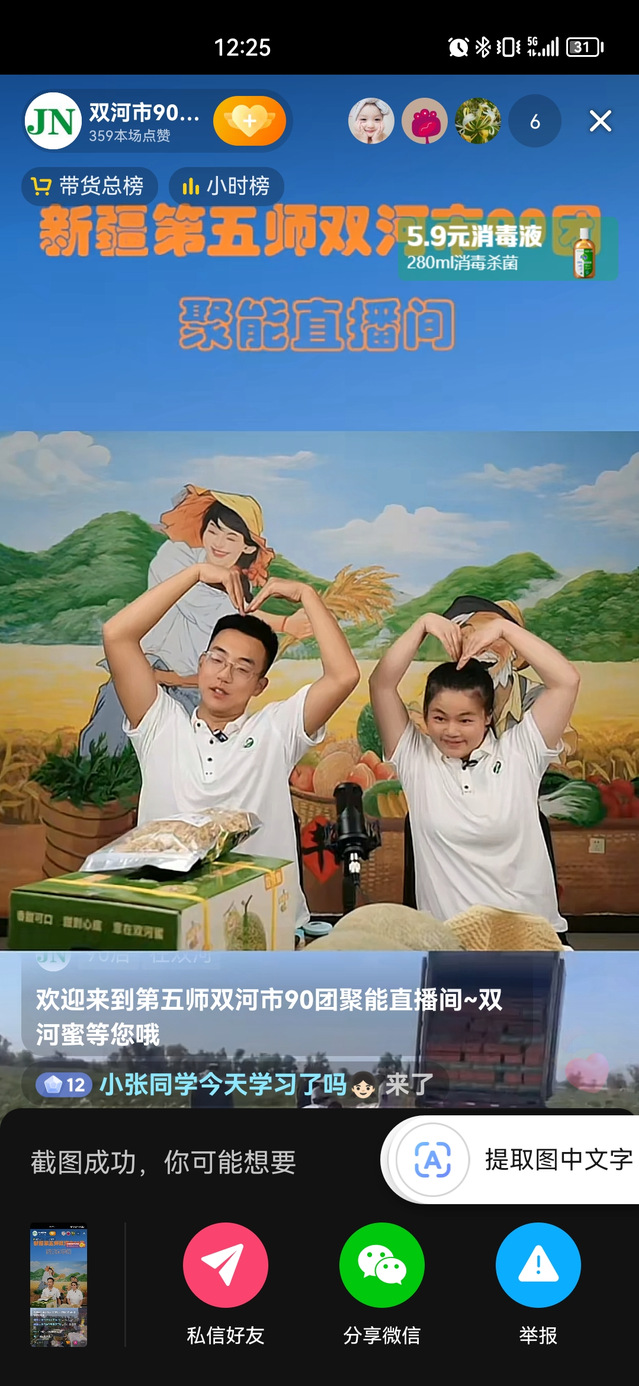 产业振兴是乡村振兴的重要环节,第五师九十团积极探索促进农民增收的致富路,立足当地特色资源,搭建直播平台,不断拓宽当地农产品的销售渠道。实践团成员陈慧玉、王子旭、张亚男分别在“双河蜜”的种植基地和当地的电商服务中心进行了直播助农,累计点赞量超15万,为乡村振兴贡献了青春力量。实践团成员张晏川表示:“作为青年学生,更需要不畏艰苦,投身于乡村振兴的征程中,要守得住寂寞,更要耐得住寂寞,为建设祖国做出自己的一份贡献!”