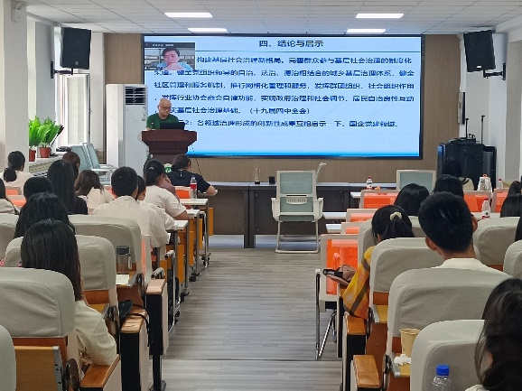 刘新刚教授的讲解一共分为四个部分:中国式现代化研究离不开资本治理研究视野、基于资本治理视野如何开展中国式现代化研究、这一研究中的马克思主义经典著作学理资源、结论与启示,这四个部分逻辑严密、层层递进。在讲到第一部分时,刘教授指出,现代化与资本是相伴而生的,正如马克思在《资本论》中对英国现代化的研究是以资本考察为主要考察视角的,而社会主义市场经济也存在着各种形态的资本。紧接着刘教授为我们呈现出一幅以“党的自我革命”为主线的思维导图,清晰地展示出中国共产党的自我革命推动社会革命及其在新冠疫情后的进一步强化。可以得出,中国式现代化是具有中国特色的现代化,是以人民为中心的现代化,是科学理性地对待资本治理的现代化,这种现代化既有各国现代化的共同特征,更有基于自己国情的中国特色。刘教授表示,关于中国式现代化的研究内容视角新且多,研究成果也非常丰富。从马克思主义经典著作中汲取养分,积极解读中国式现代化的研究,是我们当下应该推进的一项重要的学术工程。讲座结束后,在场的老师和学生进行热烈的交流讨论,纷纷表示受益匪浅。