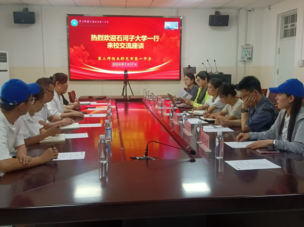 7月16日,调研组到达第三师图木舒克市第一中学,党委副书记、校长袁红霞,师市名师工作室主持人蔡群、教研室副主任罗世成等参加了座谈。袁红霞校长、蔡群老师、高智超老师、罗世成老师分别从天山英才名师工作室建设、兵团精神育人、兵团大中小学思政课一体化和铸牢中华民族共同体意识几个角度进行了分享。双方就不同学段的衔接、教学内容整合、教学资源共享交换了意见,针对三师中学提出的活动开展很多,但理论构建不足、深度挖掘不够、高度提升不足等的问题,yl23455永利官网徐艳副院长明确表示要更加主动、充分、有效发挥yl23455永利官网的专业优势和作为兵团大中小学思政课一体化共同体牵头单位引领作用,增进兵团大中小学思政课育人成效。