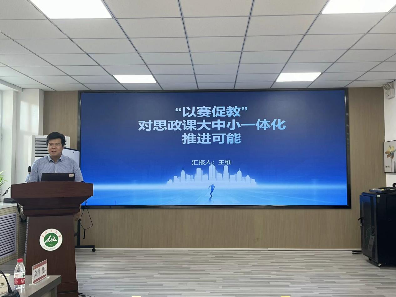 王维带来了“‘以赛促教’对大中小思政课一体化推进可能”的主旨发言,认为“以赛促教”能够通过在教学能力上统一标准、在教学案例上打破界限、在教学设计上打造金课以及在教学目标上实现一体化,更好推动大中小思政课一体化建设。